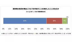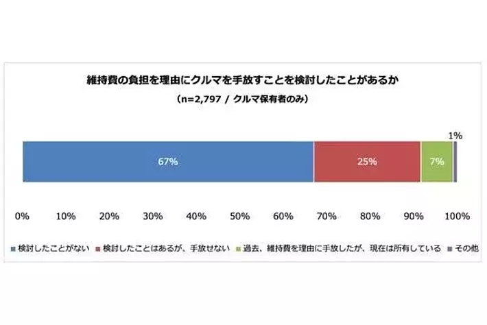 クルマ保有者に、維持費の負担を理由にクルマを手放すことを検討したことがあるか尋ねると、「検討したことがない」67%、「検討したことはあるが、手放せない」25%、「過去、維持費を理由に手放したが、現在は所有している」7%となりました。