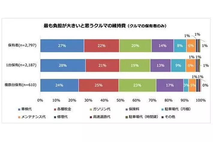 2. 最も負担が大きいクルマの維持費、クルマ1台保有者は「車検代」、複数台保有者は「各種税金」