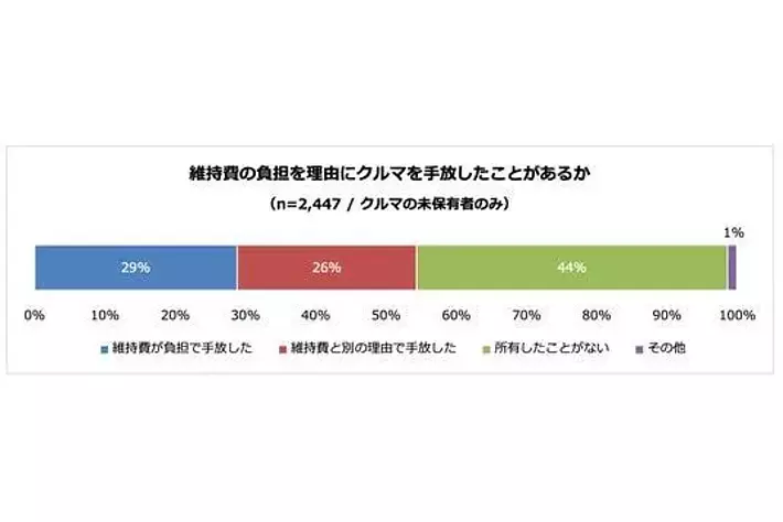 クルマを保有していない人では、「維持費が負担で手放した」29%、「維持費とは別の理由で手放した」26%となりました。「その他」のフリーコメントには「引越しを理由にクルマを手放したことがある」といった回答が見られました。