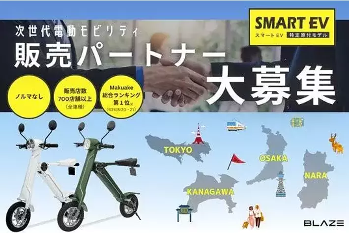 株式会社ブレイズ(愛知県名古屋市、代表取締役:市川 秀幸、以下 ブレイズ)は、2024年末に、一般販売開始となった特定小型原動機付自転車「SMART EV 特定原付モデル(以下、スマートEV 特定原付モデル)」を、一緒に販売して頂けるパートナー様を募集いたします。