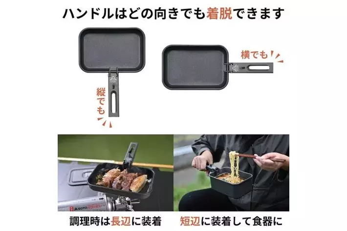 また鍋・フライパンへどの向きでも着脱できるため、ハンドル位置を変更することで色々な使い方が可能です。