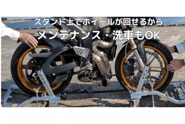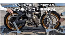 バイクをスタンド設置状態で前後輪を回転させることができ、ホイール周りの清掃やメンテナンスが容易になりました