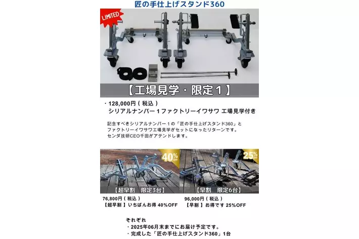 センダ技研合同会社(東京都渋谷区、代表:千田明生)は、バイク整備の効率を大幅に向上させる「匠の手仕上げスタンド360」を開発。2025年2月25日よりMakuakeにてクラウドファンディングを開始します。