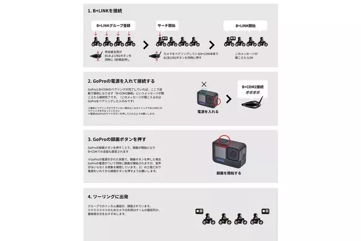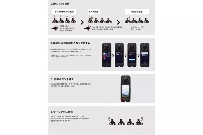 バイク用Bluetoothインカム「B+COM」シリーズ「SB6XR / SX1 / ONE / SB6X」とアクションカメラ(Insta360 X4 / GoPro HERO13)の動作確認を行い、インカム通話の音声をアクションカメラの映像に追加できるようになったことを発表いたします。