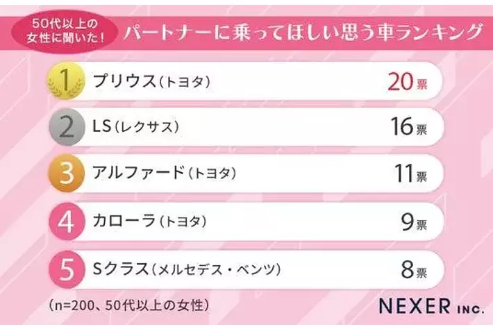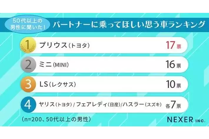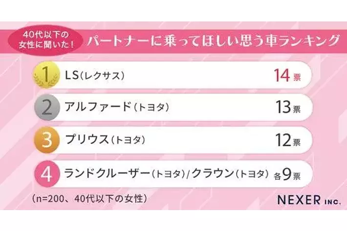 今回の調査では、パートナーに乗ってほしい車として、「プリウス(トヨタ)」と「LS(レクサス)」が特に人気であることがわかりました。