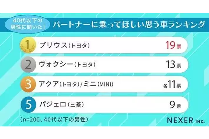今回は、パートナーに乗ってほしい車に関するアンケートを取り、その結果をランキングにしました。