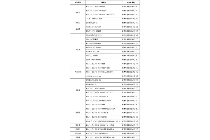 電気自動車(EV)向け充電サービス「Terra Charge(テラチャージ)」を展開するTerra Charge 株式会社(本社:東京都港区、代表取締役社長:徳重徹、以下「当社」)は、東急不動産株式会社(本社:東京都渋谷区、代表取締役社長:星野浩明、以下「東急不動産」)と東急リゾーツ&ステイ株式会社(本社:東京都渋谷区、代表取締役社長:粟辻 稔泰、以下「東急リゾーツ&ステイ」)とともに、「東急ハーヴェストクラブ」をはじめとするホテルやゴルフ場など全国33のリゾート施設へ6kW出力の普通充電器計52口を設置し、サービス提供を開始いたしましたのでお知らせいたします。