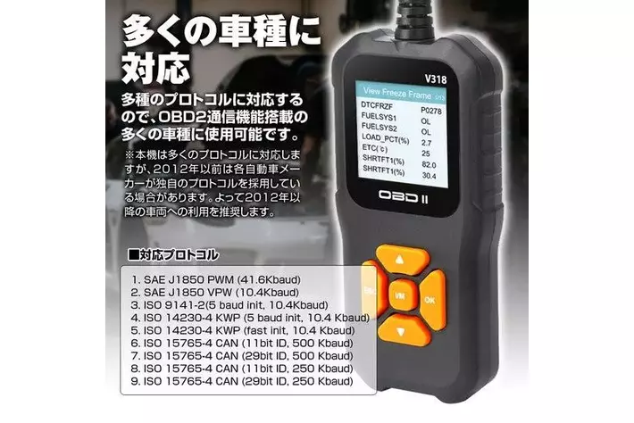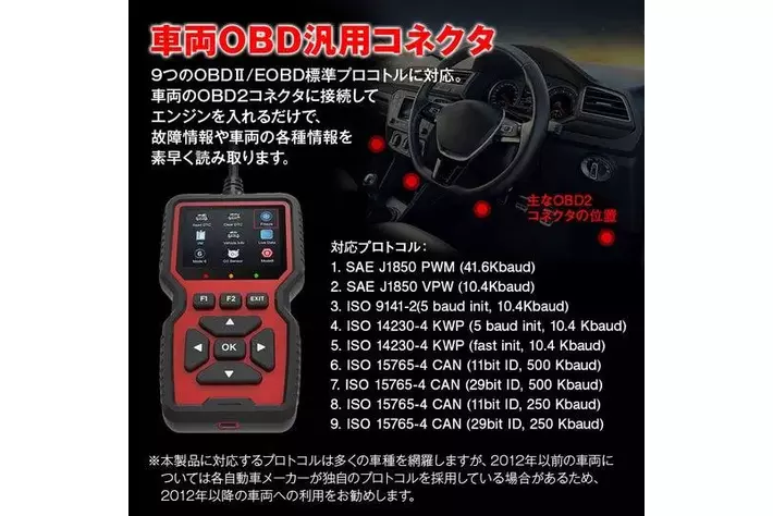 ※本機は多くのプロトコルに対応しますが、2012年以前は各自動車メーカーが独自のプロトコルを採用している場合があります。
