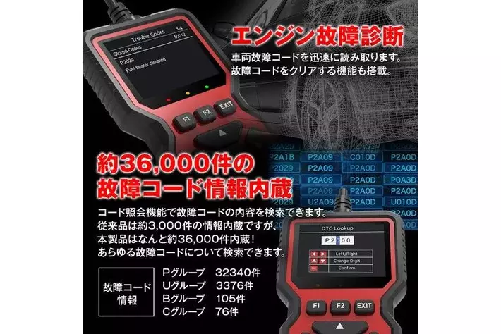 コード照会機能で故障コードの内容を検索できます。従来品は約3000件の情報内蔵ですが、本製品はなんと約36000件内蔵!あらゆる故障コードについて検索できます。