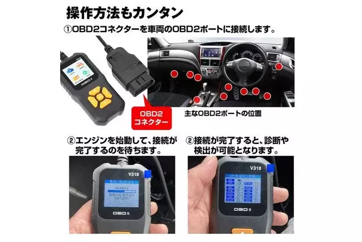 本機のOBD2コネクターを車両のOBD2ポートに接続するだけでOK。 エンジンを始動し、接続させると検出可能になります。