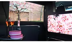 このような背景を受け、「TOKYO CHAUFFEUR SERVICE」から都内の桜名所を最高級車両のLMで巡る「SAKURA RIDE PLAN」をご用意しました。車内では、ビールやシャンパン、桜のお菓子やおつまみをオプションで提供するほか、座席前の大型ビジョンで桜をイメージした映像を放映し、移動中から桜気分を味わうことができる空間にデザインしています。また乗車した方限定で桜仕様の乗車記念証を配布します。