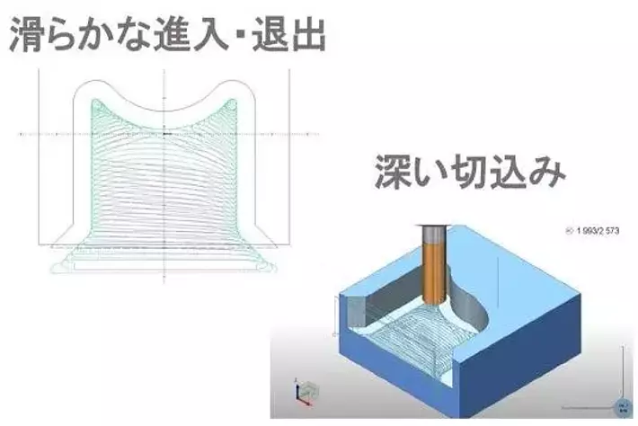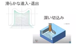 高速粗取り加工高速加工を可能にするツールパスで粗取り時間を短縮できます。深いZピッチと速い送り速度、鋭角なコーナーへの滑らかな進入退出をするツールパスでの高速加工が可能です。刃長を最大限に活用し、工具への負荷を減らすことで工具寿命を延ばします。