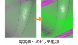 等高線・走査線でのピッチ追加等高線・走査線のツールパスに対して任意の箇所にピッチを追加することができます。形状によりピッチが粗くなることを避けるため、急斜面や緩斜面も継ぎ目のない仕上がりにできます。