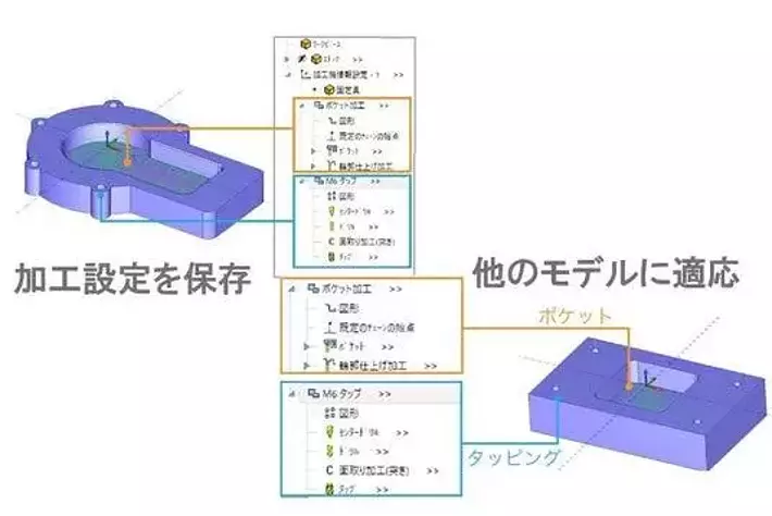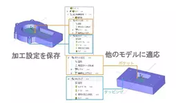 作成した加工設定をテンプレートとして保存して、他のモデルやフィーチャーに対して適応できます。形状や工程ごとにテンプレートを用意しておけば、粗取りから仕上げ、タッピングなど複数の工程をいちから作成する手間を削減し誰もが短時間でプログラムを作成できます。