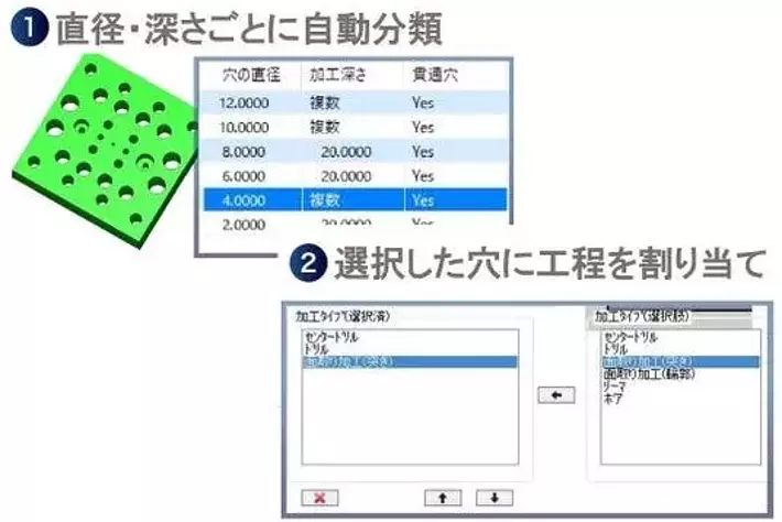 複数の穴形状を認識し自動的に分類することができます。選択した穴に対して、センタードリル、ドリル、面取り、タップなどドリル加工に必要な一連の設定を一度で行えます。一律での加工設定に加え、個別の穴ごとへのツールパス作成も可能です。穴径・深さ・工具毎に思い通りのドリル加工設定が可能です。