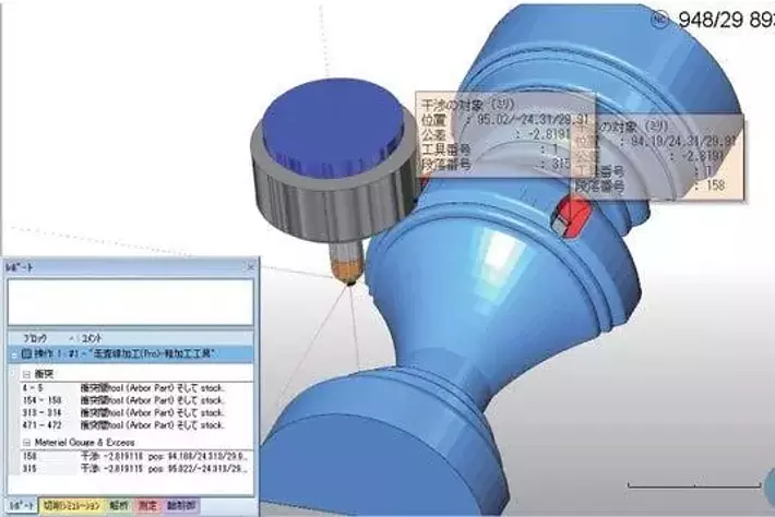 CAM画面から手軽にツールパスや工具座標確認ができるバックプロット機能に加え、加工時間予測や工具とホルダの干渉などを確認できるシミュレーション機能で加工前の検証を行うことが可能です。