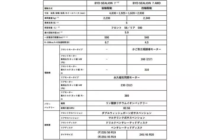 「BYD SEALION 7」は、BYDの日本導入BEVシリーズの第4弾となります。「BYD SEALION 7」は、海洋シリーズの特徴である伸びやかでエレガントなデザインを、力強いSUVのフォルムに落とし込んだクロスオーバーSUVとして登場します。モデルラインアップは、ベースモデルで後輪駆動(RWD)の「BYD SEALION 7」と四輪駆動の「BYD SEALION 7 AWD」の2グレード構成です。四輪駆動モデルは4.5秒で時速100kmに達する優れたパフォーマンスを持ちながら、クラストップレベルの航続距離(540 km/AWD 、参考:590 km/RWD)の双方を両立しています。