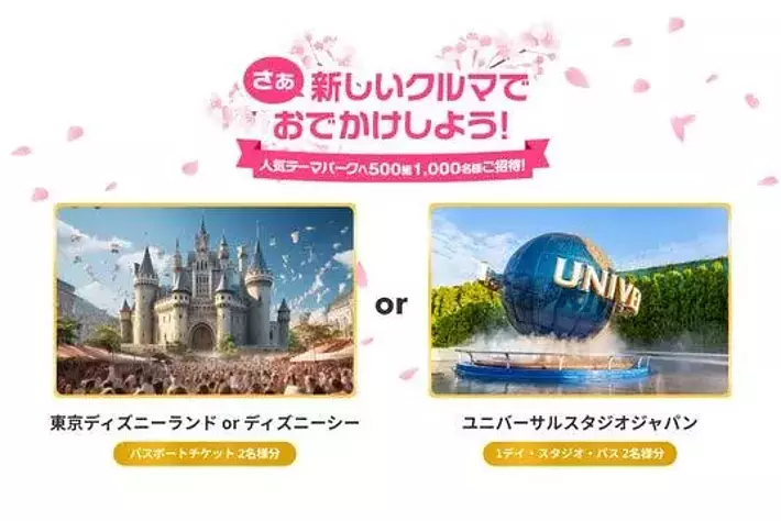 「スマート乗り換え スプリングフェア 2025」ではこの季節にうれしい人気テーマパークチケットをご用意しました。期間内に欲しいマイカーにスマートに乗り換えて、この春を人気テーマパークにおでかけしましょう!