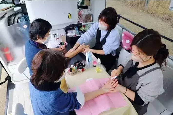 足助地区を中心とした市内の高齢者の男女を対象に、停車したe-Palette車内でフットケア・ハンドケア・爪ケア(ネイル)のいずれかを会話しながら提供しました。美容を提供したケアビューティストは介護職としても働いており、「介護美容 笑夢」として豊田市を中心とした訪問型介護美容サービスを運営しています。