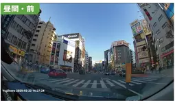 前カメラは4K映像なので、昼夜とも街の雰囲気を鮮明に伝えてきます。夜間は明るめに映っています。後カメラも画角は広め。追加費用なしで駐車監視でき、別売りのマイクロ波センサーを使えばさらに高度な監視ができるのが便利です。