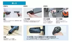 「1台あると家じゅうの掃除にいろいろ役立ってくれる洗浄機が、とっても小さくなりました。水道ホースやコンセントにつながずに使えて、折りたためる取り回しやすいサイズだから、思いついた時にサッと取り出せる気軽さが魅力。ノズルを付け替えずに先端を回すだけで噴射の広さを選べるのも、気が利いたポイントです。」