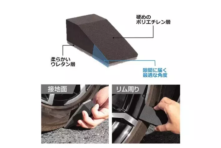 - 接地面やリム周りやなどの隙間にも施工しやすい最適な角度の専用スポンジを付属。スポンジは液を吸収するウレタンと硬めのポリエチレンの2層構造。手が汚れにくく、程よい硬さでジェルを塗りやすい(上画像:右)