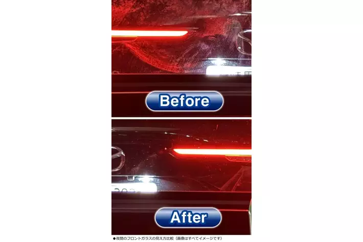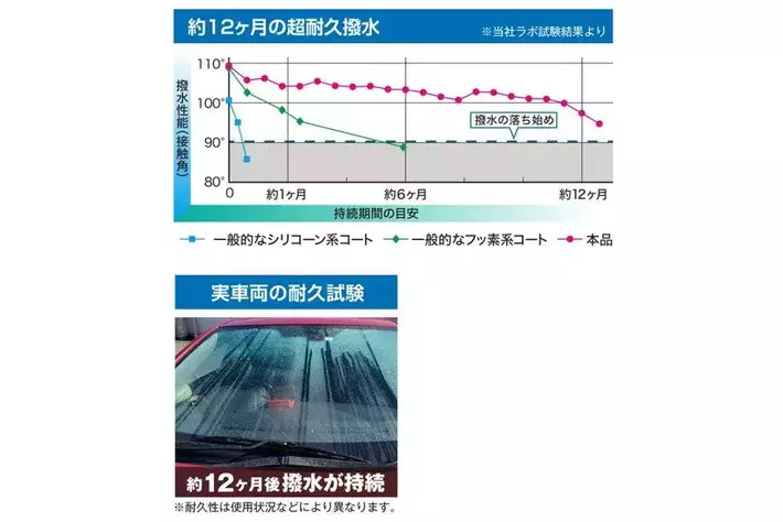 - 耐久性が高いフッ素系コーティングで、約12か月間持続(上画像:右) ※6本製品はフッ素が空気中の水分と反応し、ガラス表面と強固に密着することで、超耐久被膜を形成。油膜の付着を防止し、雪・キリの凍結も軽減。