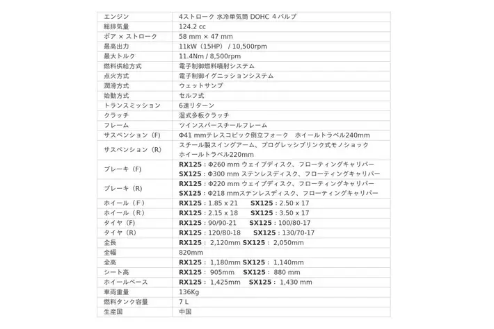 - アプリリア RX125/SX 125 主要諸元