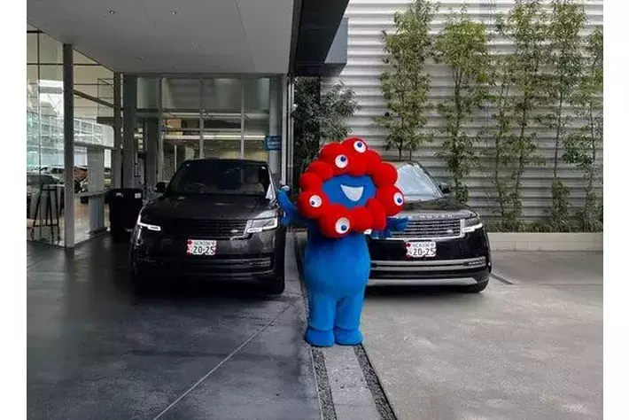 大阪・関西万博に提供されるレンジローバー。万博公式キャラクターのミャクミャクと