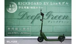 株式会社ブレイズ(愛知県名古屋市、代表取締役:市川秀幸)は、2025年3月21日(金)~4月30日(水)までの期間、ブレイズの提唱する新ブランドコンセプト「LIFE EV」(*下記参照) の下に展開する電動キックボード「KICKBOARD EV Liteモデル(以下、キックボードEV ライトモデル)」の特別カラーとして、「Deep Green<ディープグリーン>」を発売いたします。
