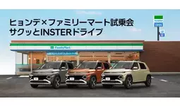 協業第一弾として、今春販売を開始する新型スモールEV「INSTER(インスター)」が試乗できる「ヒョンデ×ファミリーマート試乗会 サクッとINSTERドライブ」を、4月4日(金)から5月4日(日)までの期間、関東近郊のファミリーマート10店舗で順次開催します。また、4月8日(火)から5月5日(月)までの期間に、ファミリーマート店内に設置されているリテールメディア「FamilyMartVision」および店内放送でヒョンデのCMを配信します。