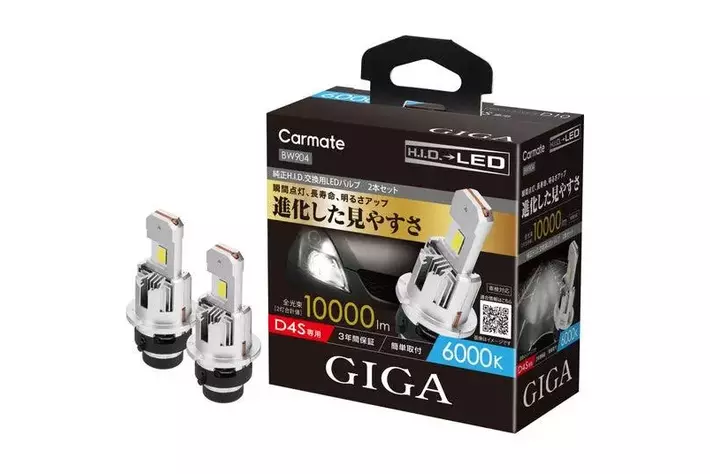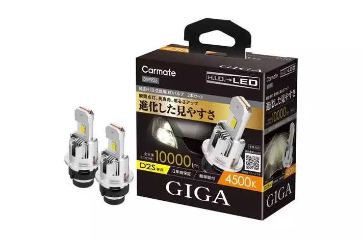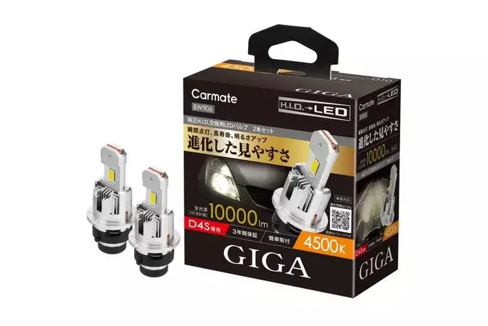 株式会社カーメイト(本社:東京都豊島区)は、自動車用ライトブランド「GIGA(ギガ)」から、純正H.I.D.バーナーから交換するLEDヘッドバルブ「GIGA LEDヘッドバルブ D10(以下、D10)」シリーズを2025年3月25日(火)に発売しました。20年間培ってきたH.I.D.バーナーの自社製造経験を活かし、純正H.I.D.を凌ぐ明るさとワイドな配光を実現しました。カラー(色温度)は、白色系の「6000K」だけでなく、これまでにない純正H.I.D.色の「4500K」も用意。市場で流通台数が多いSタイプ灯具専用(D2S/D4S)として展開します。詳細は以下をご確認ください。