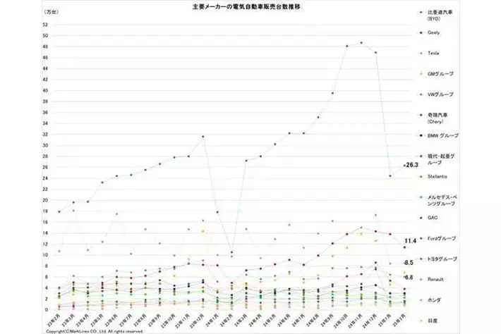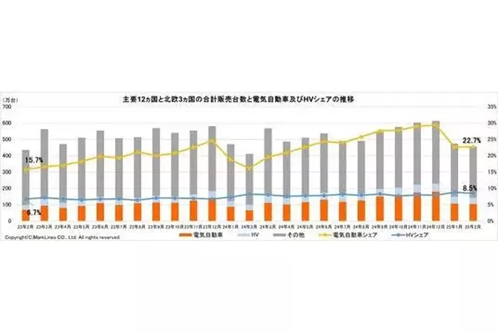 マークラインズ株式会社(本社:東京都千代田区、代表取締役社長:酒井 誠、http://www.marklines.com/) は、電気自動車の世界販売の約90%をカバーする主要15カ国を対象にグローバル市場における電気自動車の台数情報及び販売動向を分析した2025年2月の電気自動車(BEV/PHV/FCV)販売月報(商用車を除く、推計値を含む)を掲載しました。