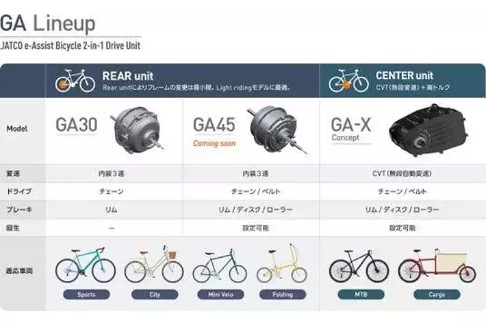 また今回、昨年発表したこのドライブユニット(GA30)の次期型となるGA45と、変速機構にCVTを採用したコンセプトモデル(GA-X Concept)を公表、ドライブユニットの搭載位置やカバーする自転車のタイプの選択肢を広げることでビジネス領域の拡大を図ります。