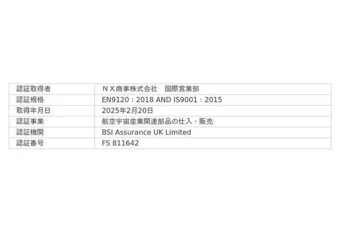 NX商事株式会社(本社:東京都港区、社⾧:青木進)は、国際営業部*においてEN9120(航空宇宙品質マネジメントシステムの国際規格)の認証を取得しました。