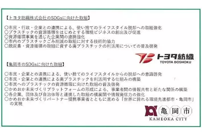 この度、この主旨に賛同していただいたトヨタ紡織株式会社(カーボンニュートラル環境センターCCNO:鈴村浩己氏)と、「かめおか未来づくり環境パートナーシップ協定」を締結し、市中から廃棄物として回収されたプラスチックを自動車部品に活用するための技術検証に連携して取り組みます。