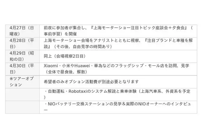 - 「ツアーオプション」(4月30日午後・新興テック系の自動運転システム解説&乗車体験)は基本プランには含まれず、希望者のみツアーオプション活動費が別途必要です。