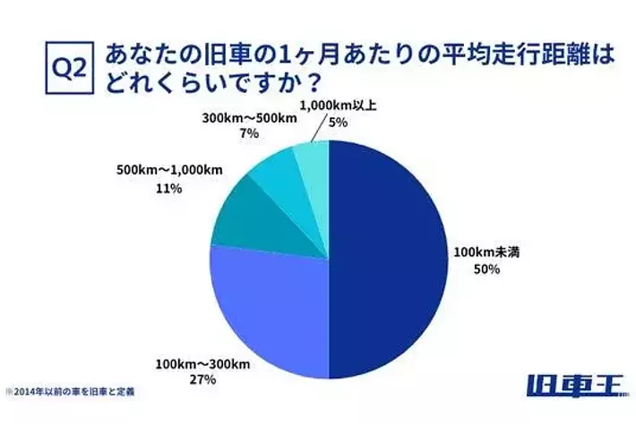 1ヶ月あたりの平均走行距離は、「100km未満」が50%と半数を占めました。次いで「100km~300km」が27%、「500km~1,000km」が11%、「300km~500km」が7%となっています。