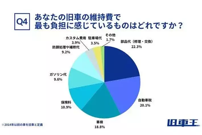 旧車の維持費で最も負担に感じているものは、「部品代(修理・交換)」で22.3%でした。次いで「自動車税」が20.1%、「車検」が18.8%、「保険料」が10.9%、「ガソリン代」が9.6%、「防錆処理や補修代」が9.2%、「カスタム費用」が3.9%、「駐車場代」が3.5%、「その他」が1.7%となっています。