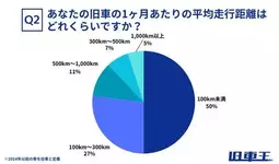 1ヶ月あたりの平均走行距離は、「100km未満」が50%と半数を占めました。次いで「100km~300km」が27%、「500km~1,000km」が11%、「300km~500km」が7%となっています。