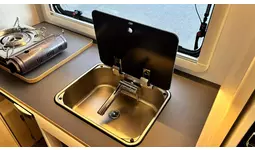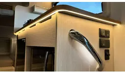 ギャレーには、LEDの照明、カセットコンロ奥には飛び出し防止付きの調理小物入れを追加し、おしゃれで便利な空間にパワーアップしました。