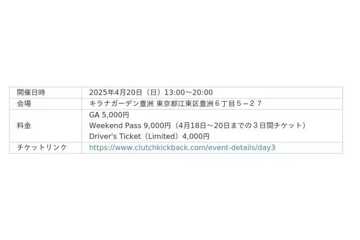 そんな「The Clutch Kickback Motor Series」が2025年4月18日(金)、20日(日)に東京にて「Block Party Weekend - Clutch Kickback Motor Series Tokyo」を開催!