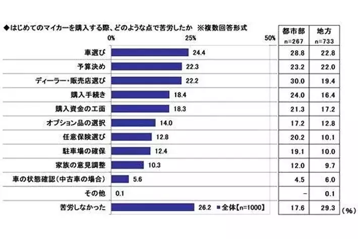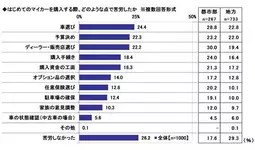 次に、全回答者1,000名に、はじめてのマイカーを購入する際、どのような点で苦労したかを聞いたところ、「車選び」(24.4%)が最も多く、「予算決め」(22.3%)、「ディーラー・販売店選び」(22.2%)、「購入手続き」(18.4%)、「購入資金の工面」(18.3%)が続きました。