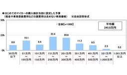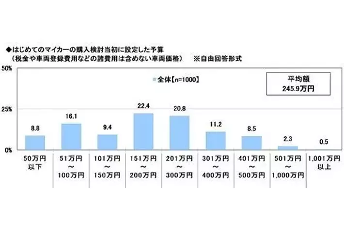 また、全回答者1,000名に、はじめてのマイカーの購入検討当初に設定した予算(税金や車両登録費用などの諸費用は含めない車両価格)を聞いたところ、「151万円~200万円」(22.4%)や「201万円~300万円」(20.8%)に回答が集まり、平均は245.9万円でした。