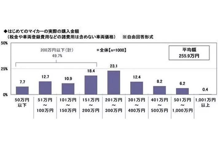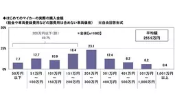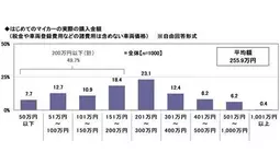 はじめてのマイカーの実際の購入金額(税金や車両登録費用などの諸費用は含めない車両価格)を聞いたところ、「201万円~300万円」(23.1%)に回答が集まり、200万円以下の割合は49.7%、平均は255.9万円でした。また、購入検討当初に設定した予算の平均(245.9万円)と比べると、実際の購入金額のほうが10.0万円高くなりました。