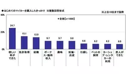 はじめてのマイカーを3年以内に購入した18歳~39歳の男女1,000名に、はじめてのマイカーを購入したきっかけを聞いたところ、「欲しい車ができた」(24.7%)が最も多く、「免許取得」(15.1%)、「就職」(13.9%)、「ボーナス・臨時収入」「趣味」(いずれも9.7%)が続きました。