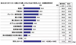 居住地別(※1)にみると、「ディーラー・販売店選び」(都市部30.0%、地方19.4%)や「任意保険選び」(都市部20.2%、地方10.1%)、「駐車場の確保」(都市部19.1%、地方10.0%)は地方と比べて都市部のほうが10ポイント前後高くなりました。また、「苦労しなかった」(都市部17.6%、地方29.3%)は都市部と比べて地方のほうが11.7ポイント高くなりました。