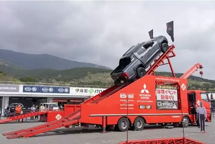 驚異の45度傾斜を登り切る4WD車の走行性能を同乗体験が可能です。車両はオールラウンドミニバン「デリカD:5」と、1tピックアップトラック「トライトン」が登場します。