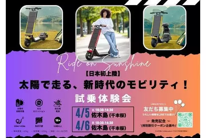先日大好評をいただいた佐木島での試乗体験イベントを、**4月5日(水)および4月6日(木)**に再度開催いたします。ちょうど桜が満開を迎えるこの時期に、桜吹雪の中でHelioXのソーラーマイクロモビリティを体験してみませんか?
