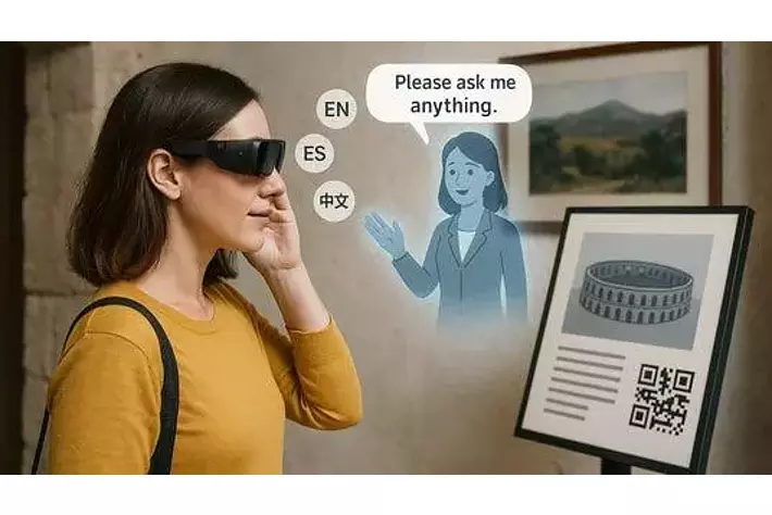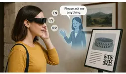 観光地・博物館・美術館などで、展示パネルやパンフレットなどにQRコードを設置。ARグラスをかけながら展示を周り、パネルを見るとAI搭載型バーチャルアシスタントが出現し、地域や展示品の説明を行います。